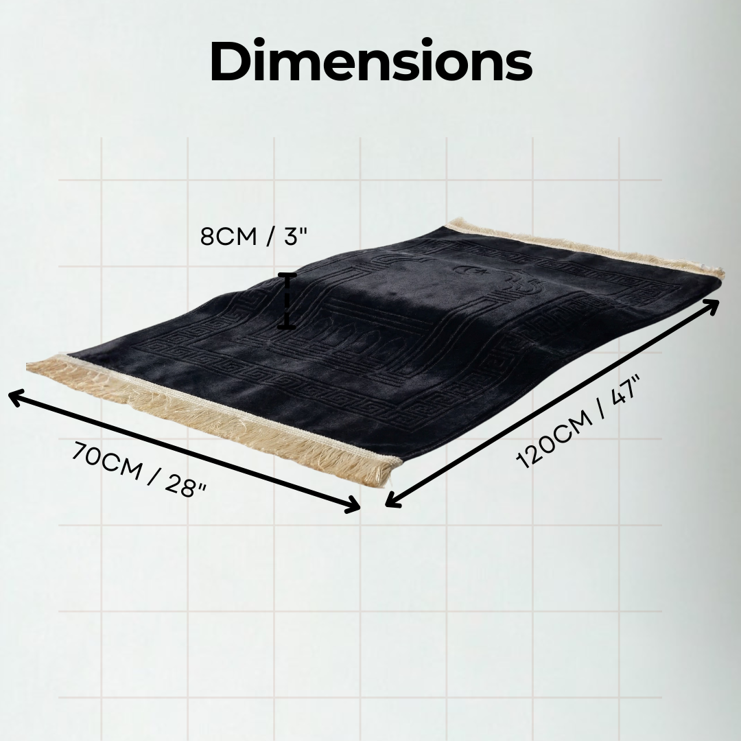 The mat has a soft velvet top, memory foam inside, and a non-slip bottom. Its size is 110 × 70 cm (about 43 × 27 inches), giving you plenty of space to pray comfortably.